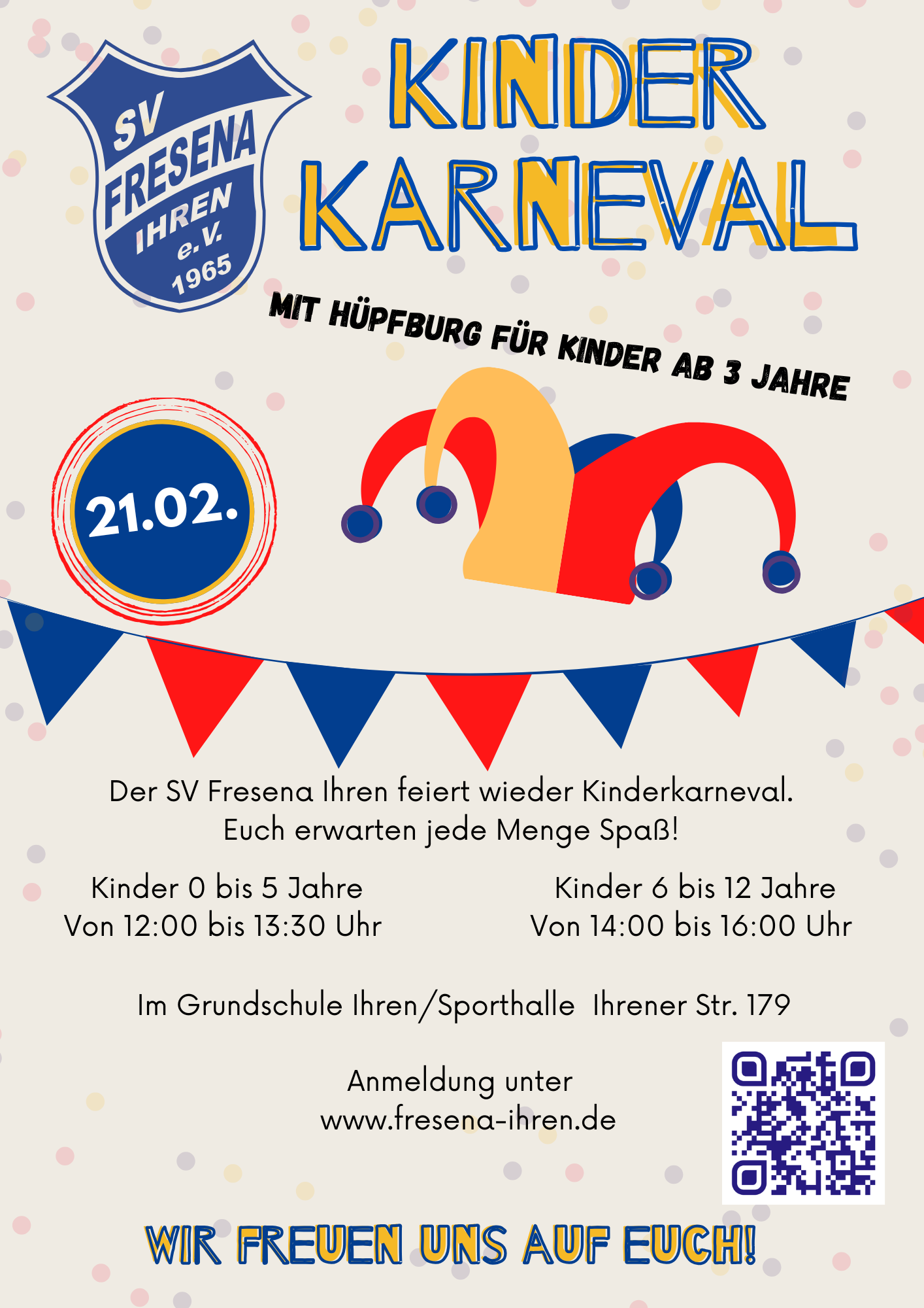 Der SV Fresena Ihren lädt alle kleinen Närrinnen und Narren herzlich zum Kinderkarneval 2026 ein! Freut euch auf einen fröhlichen Nachmittag voller Spiel, Spaß und guter Laune. 🎈 📅 Datum Samstag, 21.02.2026 📍 Veranstaltungsort Sporthalle der Grundschule Ihren Ihrener...